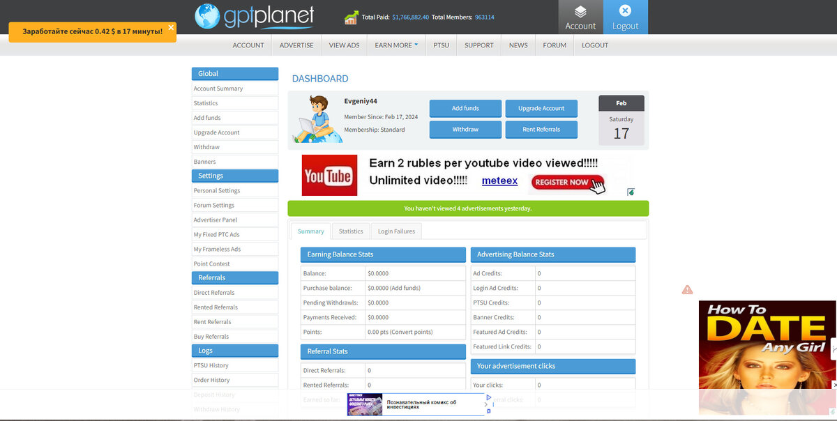 Всем привет!Сегодня рассмотрим заработок на бурж.сайтах. Потребуется VPN! GPTPlanet - это платформа, где пользователи могут заработать деньги, выполняя различные задания и просматривая рекламу. Сайт предоставляет широкий выбор возможностей для заработка, таких как оплачиваемые опросы, предложения, задания, реклама и многое другое. Для того чтобы начать зарабатывать на GPTPlanet, вам необходимо создать учетную запись на сайте и затем приступить к выполнению доступных заданий. Вам потребуется также активировать свой аккаунт и подтвердить свою личность. На сайте есть несколько способов заработка, которые можно использовать одновременно, чтобы увеличить свой доход. Один из основных способов заработка - это просмотр рекламы. Вы можете просматривать рекламу и зарабатывать за каждый просмотр. Кроме того, вы можете участвовать в оплачиваемых опросах, предложениях от партнеров, выполнить задания и многое другое. Также на сайте есть возможность заработать деньги с помощью реферальной программы.