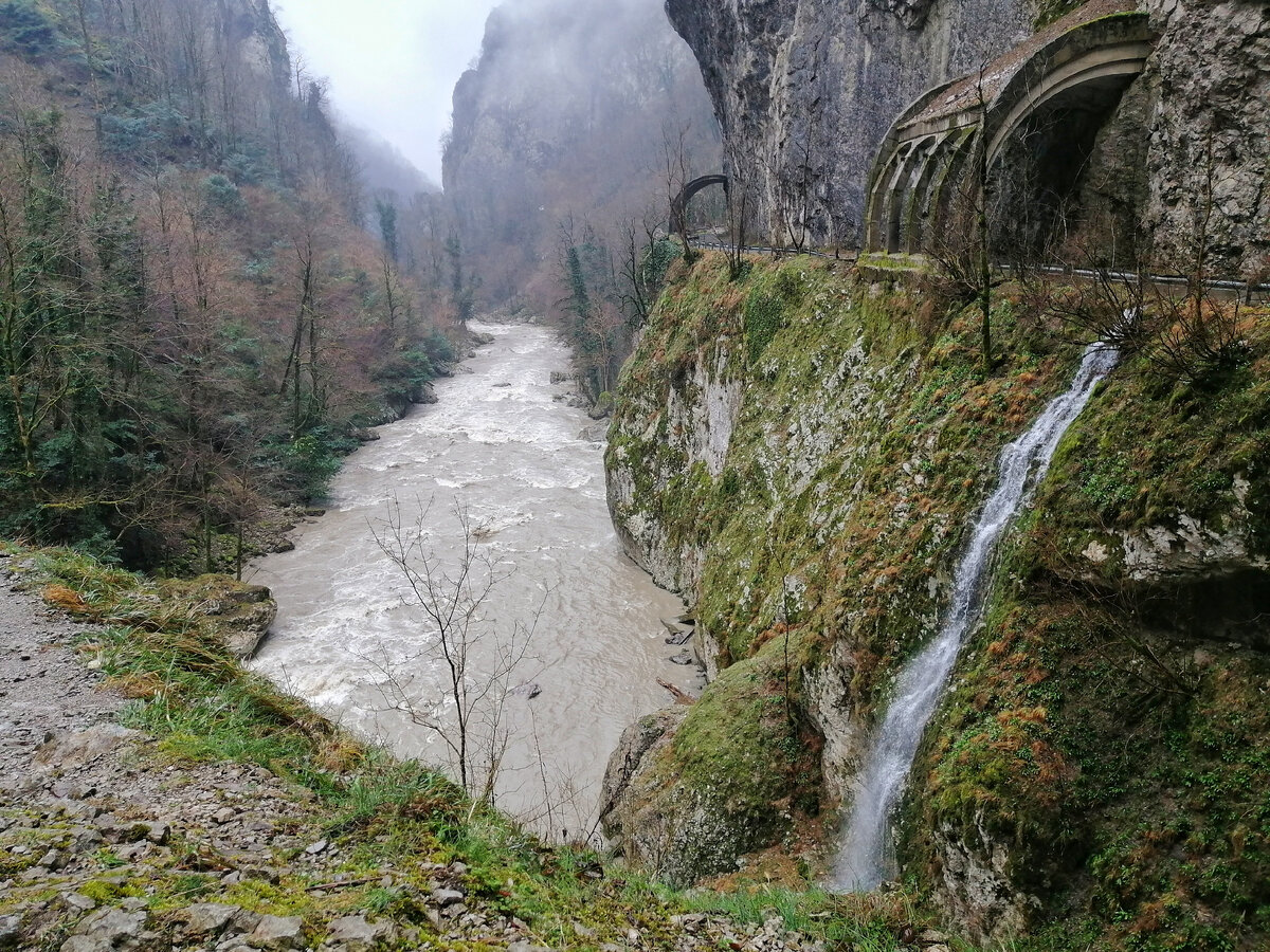 Дойдя до тоннеля, я почувствовал себя в безопасности. Действительно - дождь внутри тоннеля немного слабее (но все же есть), камни и деревья на голову не падают, но, как оказалось, я был там не один. Из темноты наружу рванул какой-то зверек размером с собаку. Не знаю кто это был - волк, лиса или енот, я его не догнал, и не понял даже куда он делся, как будто вниз с обрыва сиганул! Ну или может это был горный козёл и он убежал по вырубленной в скале выемке, похожей на пешую тропу над бурлящей коричневой рекой Мзымтой.