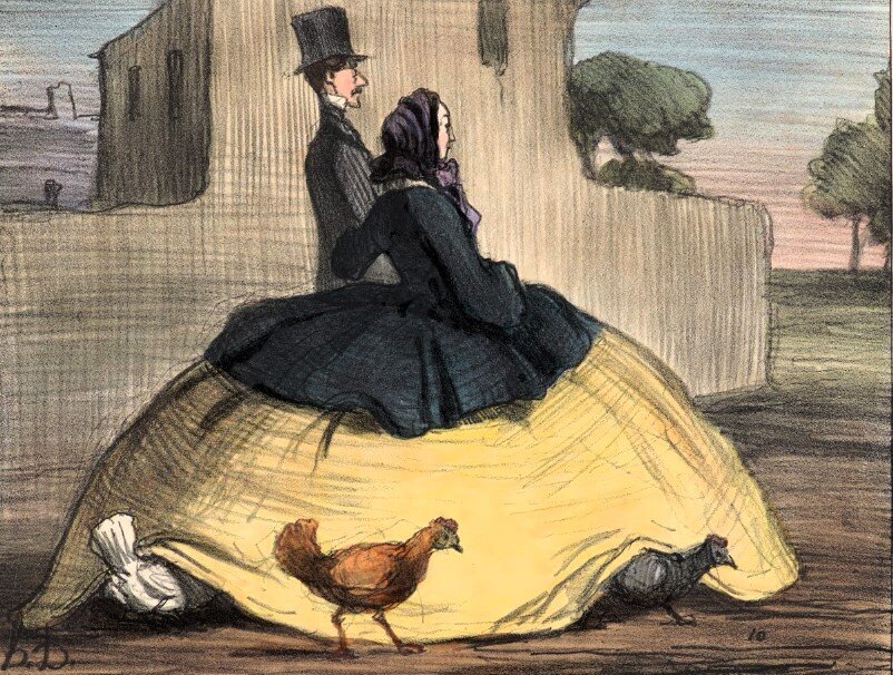 На какие только испытания не соглашалась дама, лишь бы соответствовать модным тенденциям. Чаще всего мода была не совсем удобной, а иногда и опасной. В середине 18 века безумно популярными стали кринолины. Кринолин – это, выполненный в виде нижней юбки каркас, который надевают на корсет, а поверх него - основное платье. Изначально кринолин представлял собой льняную или хлопковую ткань с основой из конских волос. Позже, в 1856 году кринолин приобрёл форму клетки со стальными кольцами, ткань заменилась на каркас, придающий юбке определенную форму. Популярность изделия стала такой, что сатирический журнал того времени «Punch» определял это явление как «Кринолиномания». Многие заводы занимались исключительно производством кринолина, выпуская до 3000 единиц ежедневно. В самом широком месте размер кринолина мог достигать 6 метров, а сделанные на заказ, «уходили» до 10-12 метров в ширину Модниц всего мира не останавливали масса неудобств, связанных с ношением этого предмета гардероба. Дамам с