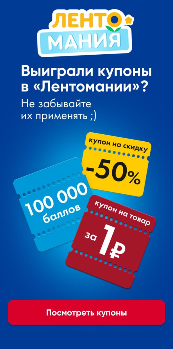 Добрый день, друзья! Я вам периодически рассказываю о том, как получить товары за 1 рубль или вовсе бесплатно. Сегодня тоже поведаю об одной акции от всеми известного гипермармаркета "Лента". В мобильном приложении Ленты сейчас проходит игра, в которой можно выиграть бесплатные товары или скидочные купоны. Как играть Заходим в приложение и нажимаем на этот значок: Открывается игровое поле: Каждый день выдается один бросок. Дополнительные броски можно получить за покупку товаров партнёров. Что можно выиграть 🔹Купоны на скидку; 🔹Купон на товар за 1 рубль; 🔹Шанс на участие в розыгрыше 100000 баллов от Ленты. Выигранные купоны необходимо предъявить на кассе и получить скидку, либо бесплатный товар. У меня вот ветчина попалась. Правда, я такое не ем)) Подобные изделия из курицы и индейки не нравятся. Поделитесь, участвуете в такой акции? Какие товары за 1 рубль вам попадались?