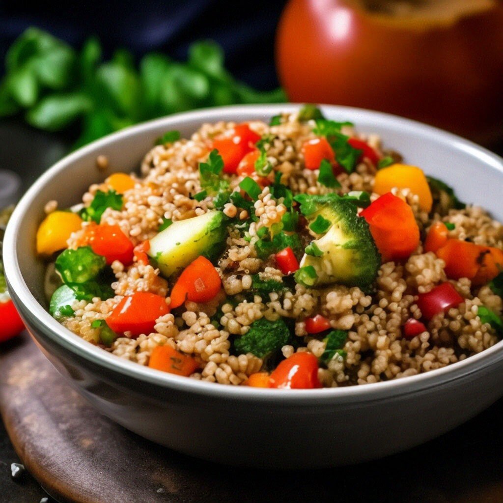 **Ингредиенты:** - Киноа - 1 чашка - Болгарский перец - 1 шт. - Цукини (кабачок) - 1 шт. - Морковь - 1 шт. - Лук - 1 средний - Чеснок - 2 зубчика - Оливковое масло - 2 ст. ложки - Соль и перец по вкусу - Свежая зелень (петрушка, базилик) для украшения **Инструкции:** 1. Промойте киноа в холодной воде. Затем варите киноа в подсоленной воде согласно инструкции на упаковке до готовности. Обычно это занимает около 15-20 минут. Отцедите, если есть лишняя вода. 2. Нарежьте овощи: болгарский перец, цукини, морковь и лук на мелкие кубики. 3. Разогрейте оливковое масло в сковороде на среднем огне. Добавьте нарезанный лук и обжаривайте, помешивая, пока лук не станет мягким и прозрачным. 4. Добавьте нарезанный чеснок и обжаривайте еще 1 минуту, пока не почувствуется аромат чеснока. 5. Добавьте нарезанные овощи в сковороду и обжаривайте, помешивая, пока они не станут мягкими, около 8-10 минут. 6. Посолите и поперчите овощи по вкусу. 7. Добавьте приготовленную киноа в сковороду с овощами