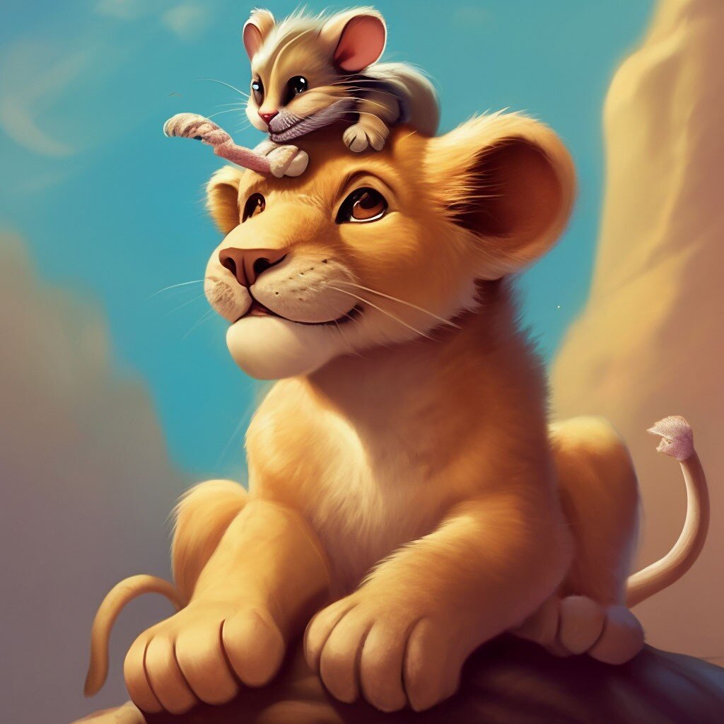 Поняв, что так его не услышат мышонок взобрался на дерево и потом по свисающей лиане, спустился прямо на голову льву. Лев не ожидал такого поворота событий. Поэтому стал усиленно мотать головой, но наш герой крепко держался за уже начавшую появляться у молодого льва, гриву.