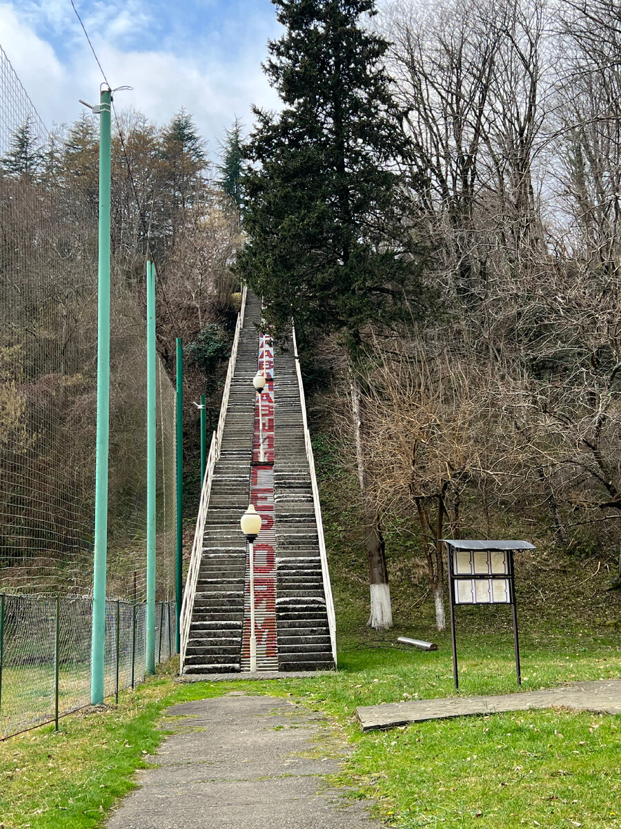 Конечно туман не очень зовёт на улицу, но мы отправляемся на машине к селу Нор-Луйс. В селе начинаем подниматься по лестнице в которой я насчитал более 170 ступенек. На лестнице читается надпись «Вечная слава нашим героям».