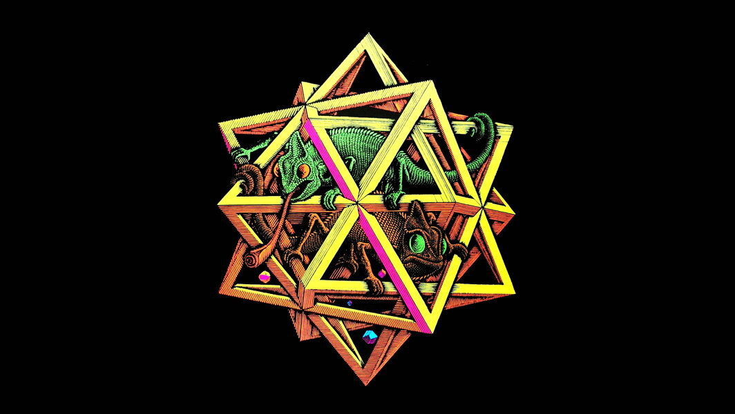 Здесь художник разрабатывает излюбленную тему правильных многоугольников. Изображенные звездчатые фигуры получены в результате объединения тетраэдров, кубов и октаэдров. Попавшие в геометрические клетку, хамелеоны придают гравюре эффект неожиданности..