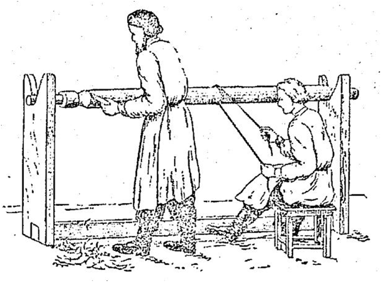 Позднее для приведения заготовки в движение применяли лук со слабо натянутой (провисающей) тетивой. Тетиву оборачивали вокруг цилиндрической части заготовки так, чтобы она образовала петлю вокруг заготовки. При движении лука то в одну, то в другую сторону, аналогично движению пилы при распиливании бревна, заготовка делала несколько оборотов вокруг своей оси сначала в одну, а затем в другую сторону.