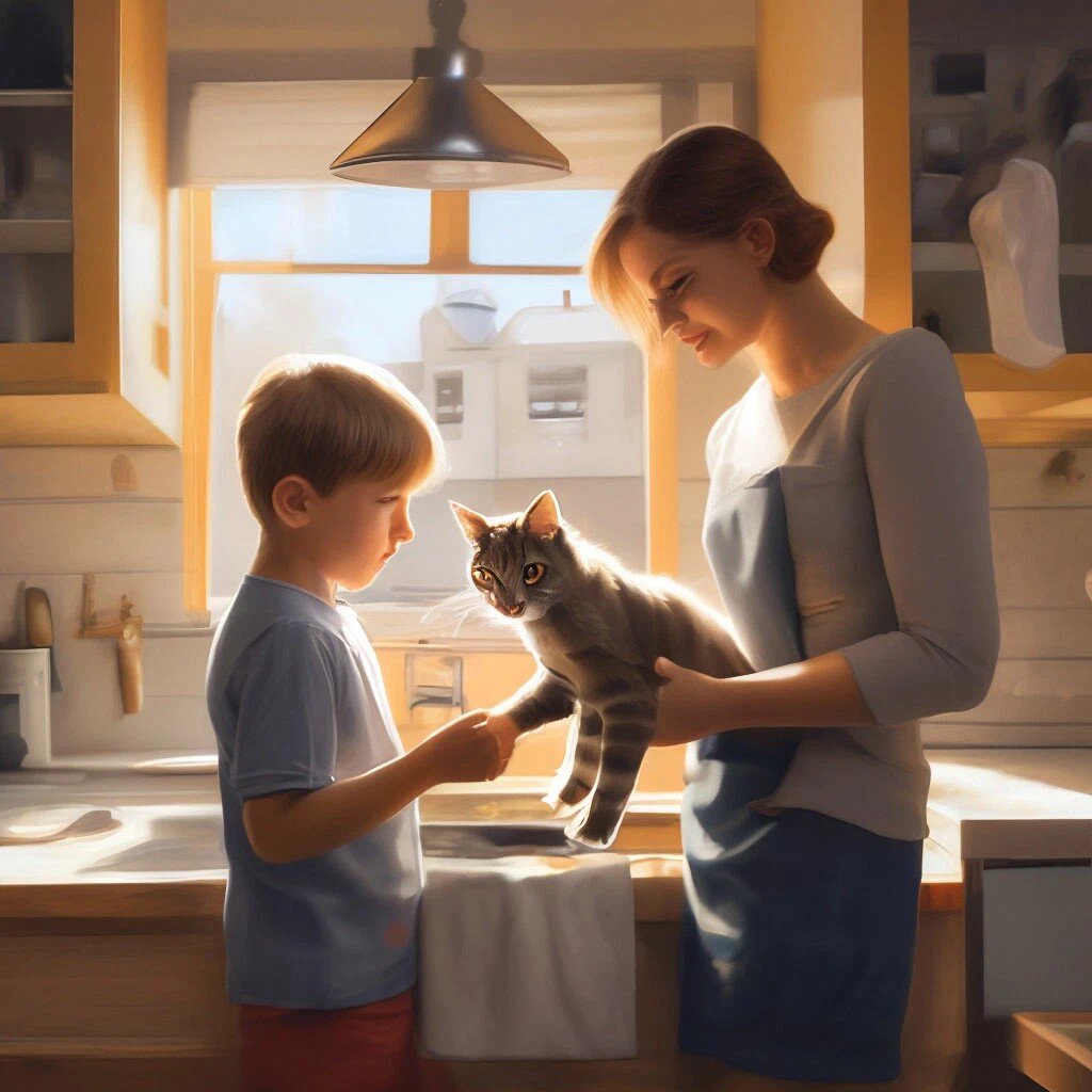 Миша услышал, как в дверях поворачивается ключ и понял, что идет мама. Он схватил кота, быстро побежал к себе в комнату и затолкал его под кровать. - Аккуратнее, пожалуйста, со мной, - сказал кот, - я еще после твоего рюкзака в себя не пришел. - Извини, посиди здесь, пожалуйста, - сказал Миша, - и задернул плед, чтобы мама невзначай его не увидела, и сам побежал ее встречать. - Привет, мам, - осторожно начал разговор Миша, забирая у мамы пакет с продуктами. - Привет, родной, - ответила она, обняла его и поцеловала в макушку. Мама сняла обувь, и пошла в сторону ванны. Чуть погодя, уже в домашней одежде, она присоседилась к Мише. Миша уже почти разложил все продукты, что приятно порадовало маму. - Как дела, сынок, в школе? – спросила мама. - Нормально, мам, - ответил Миша. И чтобы она не успела задать следующий вопрос, сразу же спросил: - А у тебя на работе как дела? - Все своим чередом, - промолвила мама. - Ты, наверное, устала. Не хочешь полежать, отдохнуть, - продолжил