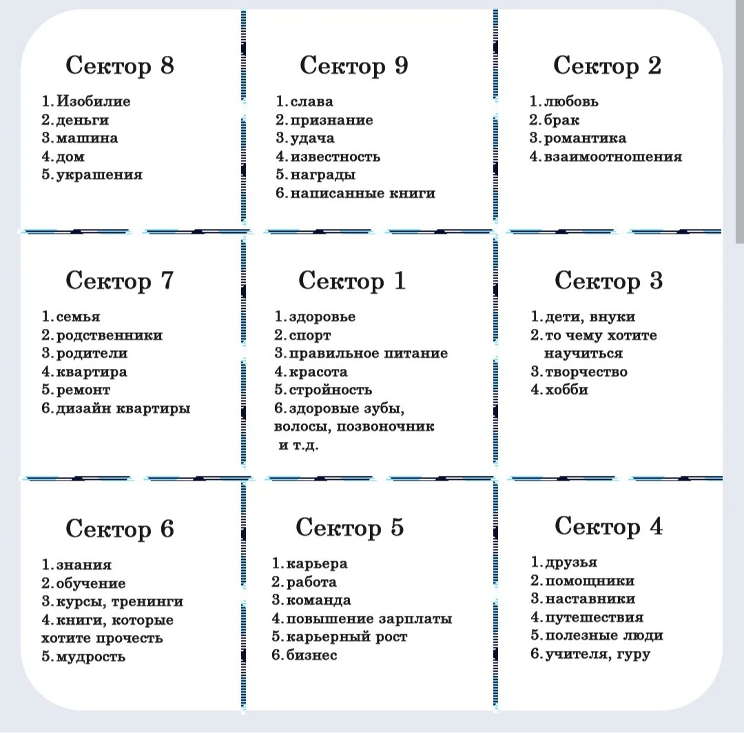 Карта желаний делиться на 9 секторов, где центр это вы, а вокруг сферы жизни. Не один из секторов не должен пустовать, должно быть одинаковое количество желаний, это необходимо для соблюдения гармонии. Сектор здоровья Здесь нужно разместить ваше фото в полный рост или портрет. Фото должно быть относительно новое, сделанное в течение года-двух. Вы на нем должны быть счастливы, должны проживать какие-то положительные эмоции. Здесь же будут картинки желаний про красивое тело, спортивную фигуру, занятия спортом, душевный комфорт, правильный и здоровый образ жизни. Можно подписать фото: Я излучаю счастье, здоровье, гармонию. У меня стройное, спортивное, подтянутое тело. Но не в коем случае не писать "я похудела на столько-то кг", ведь похудеть можно и при болезни, а нам это не нужно. Сектор любви и отношений Этот сектор связан только с двумя желаниями, найти свою вторую половинку (выйти замуж) или улучшить уже существующие отношения. Если ваша мечта – встретить свою вторую половинку, умес