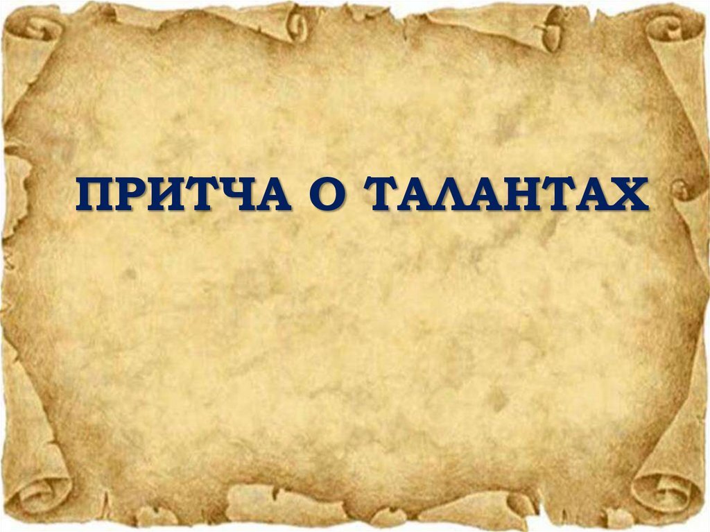 «Ибо Он поступит, как человек, который, отправляясь в чужую страну, призвал рабов своих и поручил им имение свое. И одному дал он пять талантов, другому — два, иному — один: каждому по его силе. И тотчас отправился. Получивший пять талантов пошел, употребил их в дело и приобрел другие пять талантов; точно так же и получивший два таланта приобрел другие два; получивший же один талант пошел и закопал его в землю и скрыл серебро господина своего. По долгом времени приходит господин рабов тех и требует у них отчета. И, подойдя, получивший пять талантов принес другие пять талантов и говорит: “Господин! Пять талантов ты дал мне; вот другие пять талантов я приобрел на них”. Господин его сказал ему: “Хорошо, добрый и верный раб! В малом ты был верен, над многим тебя поставлю; войди в радость господина твоего”. Подошел также и получивший два таланта и сказал: “Господин! Два таланта ты дал мне; вот другие два таланта я приобрел на них”. Господин его сказал ему: “Хорошо, добрый и верный раб! В малом ты был верен, над многим тебя поставлю; войди в радость господина твоего”. Подошел и получивший один талант и сказал: “Господин! Я знал тебя, что ты человек жестокий, жнешь, где не сеял, и собираешь, где не рассыпал, и, убоявшись, пошел и скрыл талант твой в земле; вот тебе твое”. Господин же его сказал ему в ответ: “Лукавый раб и ленивый! Ты знал, что я жну, где не сеял, и собираю, где не рассыпал; поэтому надлежало тебе отдать серебро мое торгующим, и я, придя, получил бы мое с прибылью. Итак, возьмите у него талант и дайте имеющему десять талантов, ибо всякому имеющему дастся и приумножится, а у неимеющего отнимется и то, что имеет; а негодного раба выбросьте во тьму внешнюю; там будет плач и скрежет зубов”». Сказав это, возгласил: «Кто имеет уши слышать, да слышит!» (Мф. 25:14-30).