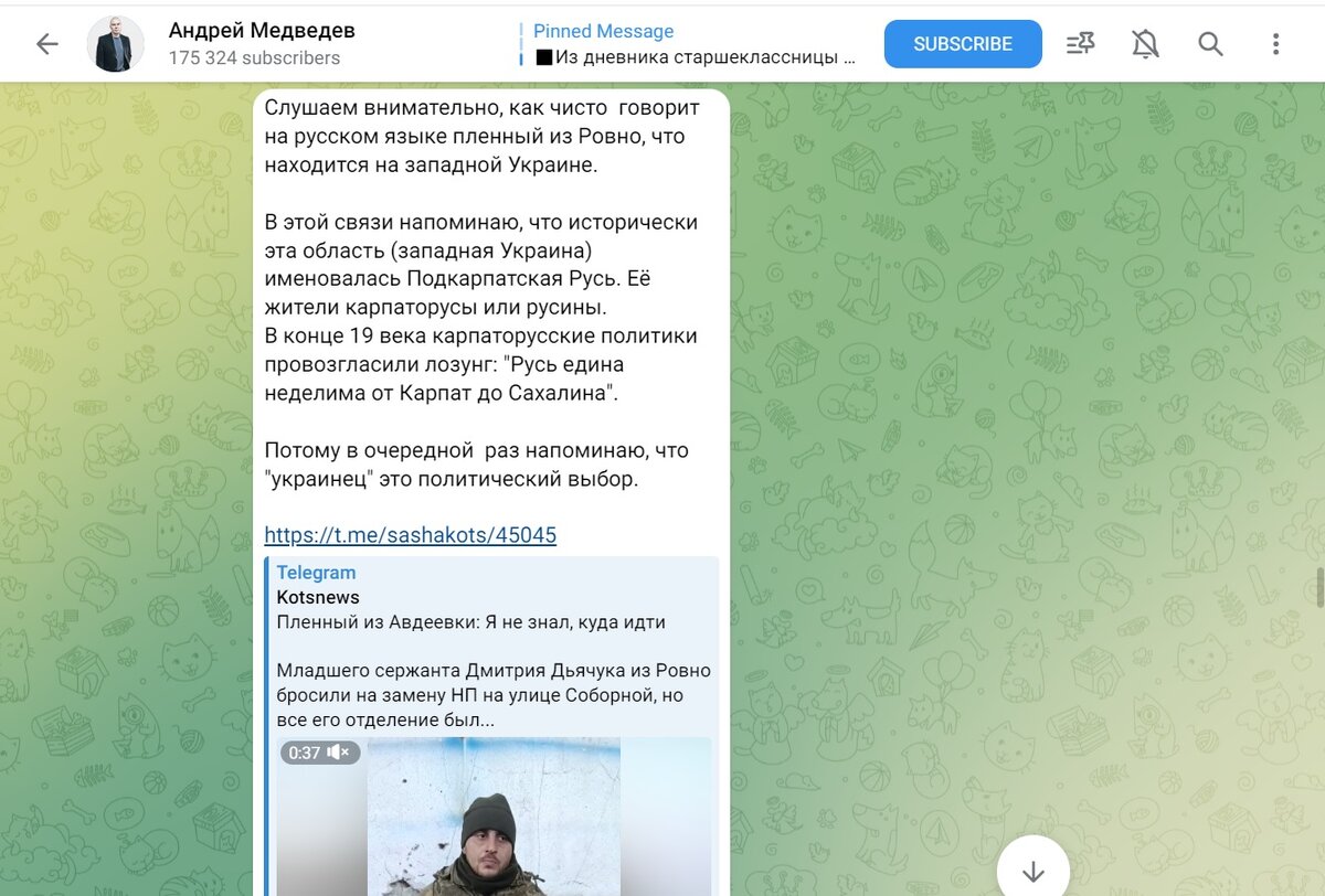 Слушаем внимательно, как чисто говорит на русском языке пленный из Ровно, что находится на западной Украине. В этой связи напоминаю, что исторически эта область (западная Украина) именовалась Подкарпатская Русь. Её жители карпаторусы или русины. В конце 19 века карпаторусские политики провозгласили лозунг: "Русь едина неделима от Карпат до Сахалина". Потому в очередной раз напоминаю, что "украинец" это политический выбор.