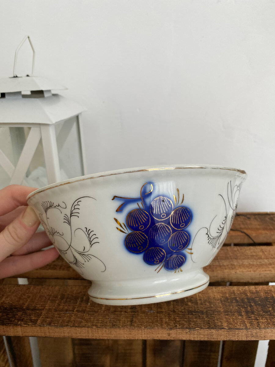 Внеочередное, но такое желанное винтажное обновление случилось у меня на выходных! Разбирали бабушкину кухню и столько всяко-разного красивого привезли❤️ Причем часть вещей я хорошо помню, даже пользовалась, а с некоторыми только сейчас случилось познакомиться. Как, например, этот расписной салатник. Я за всю жизнь у бабушки его никогда не видела! Просто поразительная у нее была способность беречь вещи, а посуду - тем паче! Сей затейливый рисунок в народе называется «Виноград». На другой стороне красуется такой же кобальтовый виноградный лист По двум другим сторонам - нарисованные вручную дивные цветы «Виноград» изготовлен на Кузяевском фарфоровом заводе. Его история началась в XIX в. с легкой руки Якова Герасимовича Храпунова, который умело превратил доставшуюся в комплекте с женой фарфоровую мастерскую в «Фабрику Храпунова-Новаго». Мы уже видели их чудесный дореволюционный фарфор в Музее самоваров) В 1920-х фабрика, конечно, была национализирована и переименована в Кузяевский фарфор