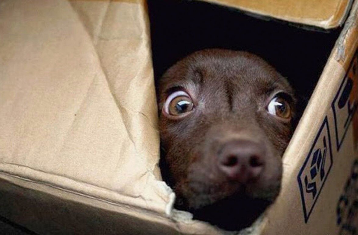 Из коробки выглядывала любопытная мордочка щенка. Он активно старался выбраться из коробки, но высота бортиков этого не позволяла.