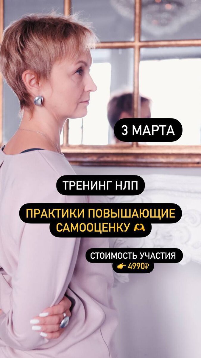 Тренинг НЛП 👉 Техники повышающие самооценку 😉 Представьте, что внутри вас скрыта неиссякаемая сила, способная преобразить вашу жизнь. Вам интересно? Тогда добро пожаловать на тренинг, который станет вашим компасом к самоуверенности и истинной самооценке! Это для вас, если: 🔸Вы мечтаете об уверенности, которая не покидает в сложных ситуациях. 🔸Вы устали от роли "хорошего для всех" и готовы встретиться с собой настоящим. 🔸Вы ищете ключи к быстрому и глубокому личностному росту. Что вас ждет: ✅Откроете тайные двери к своей уверенности и поймете, что стоит на пути к высокой самооценке. ✅Освоите магию управления своими мыслями и эмоциями, словно искусный волшебник. ✅Научитесь управлять тревогой и страхом, не позволяя им диктовать свои правила. 🎁 Бонусы участникам: ✨Поменяете свой взгляд на себя и окружающий мир. ✨Обретете не только уверенность, но и поймете, как вкусно и полноценно жить с осознанием своей ценности. ✨Получите формулу, которую сразу же сможете внедрить в жизнь,
