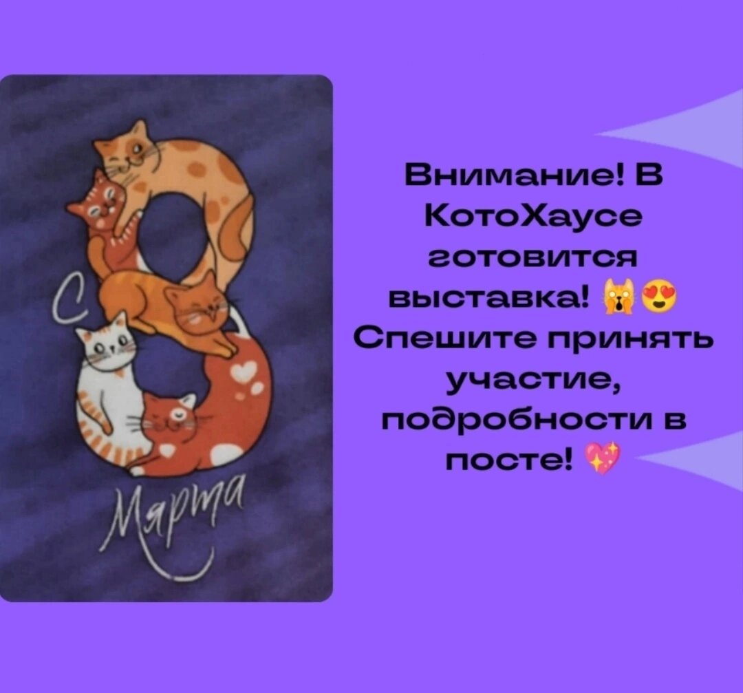 Доброе утро! Скоро весна и встретить мы её хотим с вами в ярких красках, поэтому зовём вас на выставку! 😍 8⃣ марта в КотоХаусе пройдёт выставка работ на темы: "Мой домашний кот" Или "Фантастический кот"... И вы можете принять в ней участие! 🙀 Творчество покорно любому возрасту, поэтому мы приглашаем всех почувствовать себя художниками и поделиться своим видением мира❣️ Что требуется для участия❓ 1. Ваше желание и любовь к прекрасному 🤭 2. Формат работ: А3 или А4. 3. Стиль: рисование или декоративно-прикладное творчество. 4.оформление: паспарту и этикетка с указанием названия работы, имени и фамилии автора, возраста. Выставка пройдёт по адресу🏘 "КотоХаус", Санкт-Петербург, ул. Будапештская 36 корпус 2 Когда 🕒❓ 8 марта 2024 год 1⃣ группа (15:00-15:30) 2⃣ группа (15:30-16:00) 3⃣ группа (16:30-17:00) Погрузитесь в творчество вместе с нами! 😸😻 ✴️ Просмотр будет проходить по предварительной записи группами до 15 человек. Чтобы записаться, вы можете отметиться в комментар