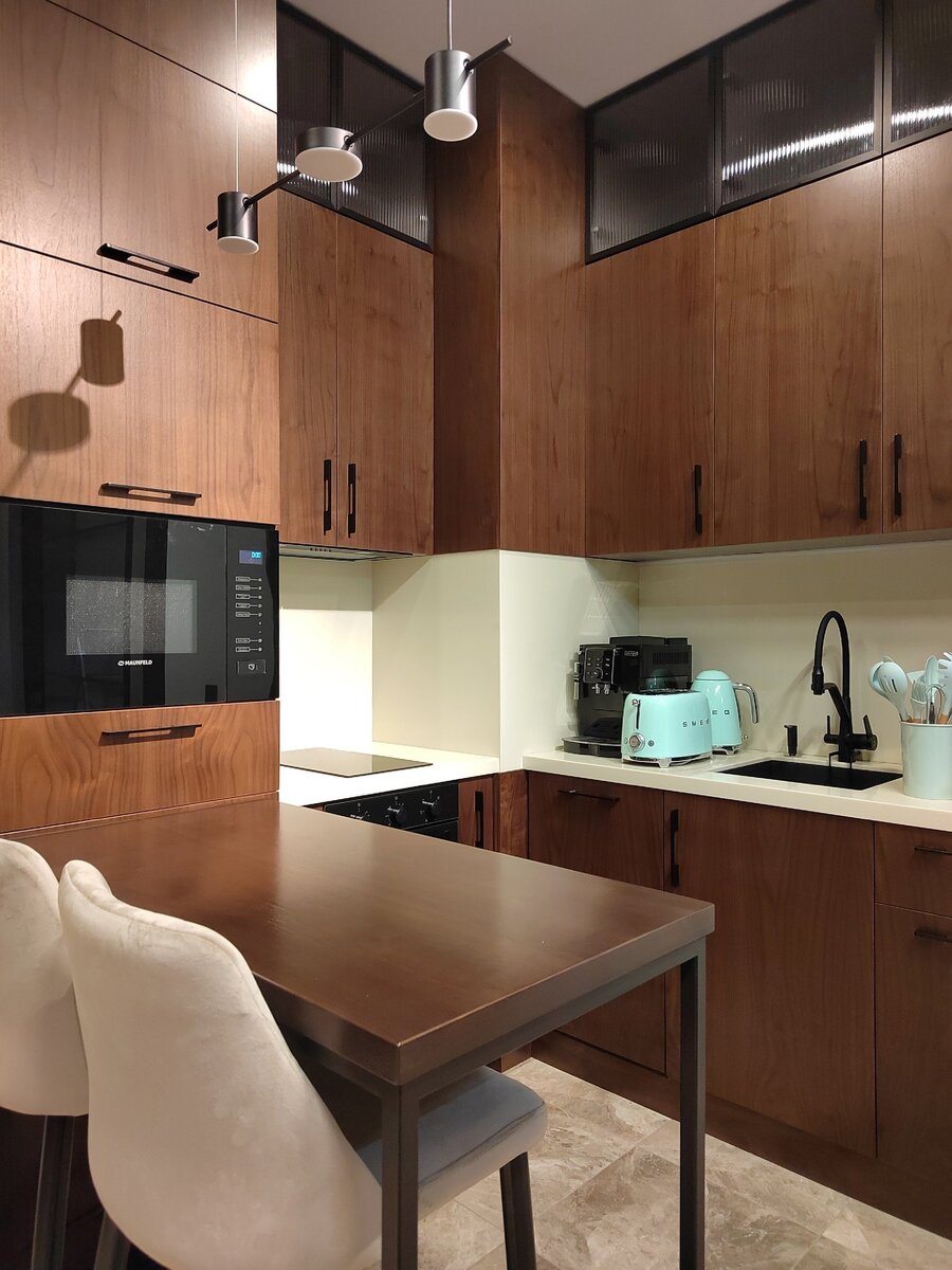 Здесь поистине продуман и использован каждый сантиметр. Сразу об излишествах и роскоши: не на каждой кухне найдётся место для двух выдвижных баз по 15 см, в простонародье "бутылочницы", мечта каждой хозяйки. А тут они есть. Кухня-малышка. Но в ней столько решено задач! Пожалуй, напишу о ней не один, а троечку постов. Хозяйка сразу оговорила момент, что готовит редко и мало, основная жизнь проходит вне квартиры. Я не стала спорить. Площадь помещения 12.24 кв.м, мебель 130, 138 см два "крыла". И это не просто кухня. ОНА ЕЩЁ СОВМЕЩЕНА С ГОСТИНОЙ (Смотрите планчик). Итак, тут есть: ⭐варочная панель шириной 30 см, ⭐духовка 45 см, ⭐посудомоечная машина 45 см, ⭐дозатор для мыла встраиваемый, ⭐мойка Омойкири встраиваемая, ⭐смеситель с интегрированным в него фильтром питьевой воды, ⭐вытяжка в шкафу, ⭐встроенная СВЧ, а ПОД НЕЙ ящичек!! ⭐ вместительные шкафы до потолк ⭐ящик для приборов Продолжение следует. Кухонная мебель, столешница и стеновые панели из искусственного камня, с