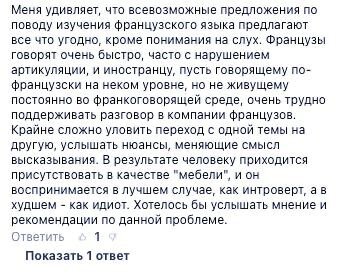 Друзья, в одной из наших социальных сетей подписчица группы оставила такой комментарий. Девушка говорит, что обучающие программы французских школ/частных преподавателей игнорируют аспект развития навыка понимания на слух ❔ Так ли это? И как можно начать решать эту проблему? Язык - это в первую очередь средство коммуникации, мы не учим язык, чтобы решать 400 упражнений из учебника. Мы учим язык, чтобы на нем говорить. ❕Понимание живой французской речи и говорение – фундаментальные проблемы при изучении французского языка Как можно убить этих двух зайцев одним выстрелом? Конечно, говорить и слушать! Прислушиваться к паузам, интонациям, в разговоре вычленять конструкции, повторять их. Некоторые слова и выражения во французском звучать идентично, например: 🇫🇷Milan // Mille ans 🇫🇷Ce car est vert // Ce carré vert. О чем идет речь? На слух без контекста понять сложно. А ведь это простые примеры из учебника Ниже - мои рекомендации для всех, кто сталкивается с проблемой понимания живой речи