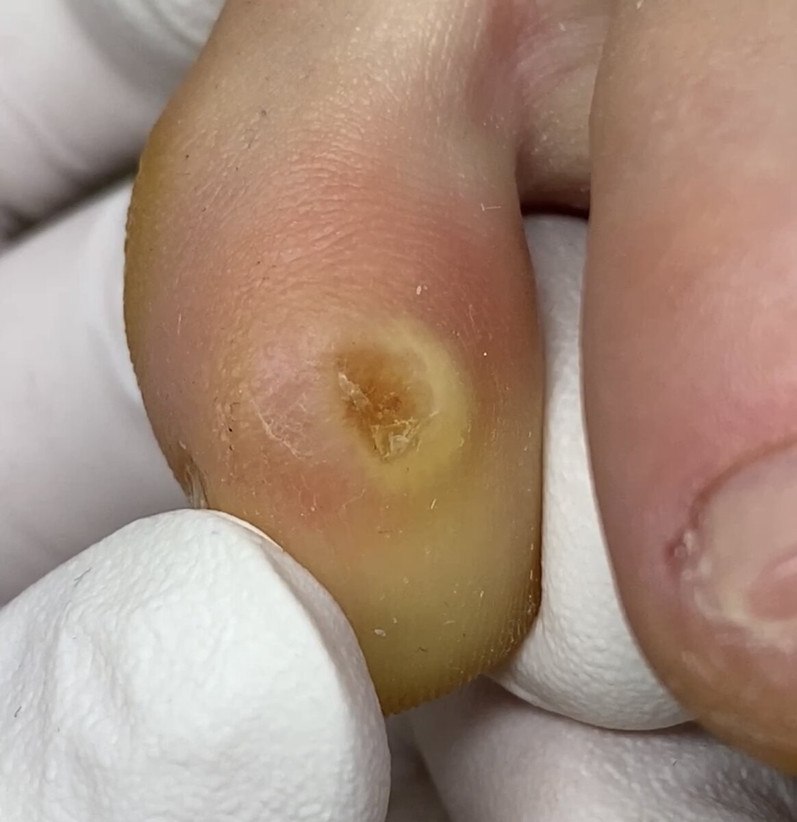 Привет! Я подолог Полина Медведева. Ко мне часто приходят клиенты с мозолями между пальцами. Они очень болезненны и мешают нормально ходить. В этой статье я хочу подробнее рассказать о мозолях. Любая мозоль это защитная реакция кожи на давление или трение. Вспомните свои новые туфли и мозоли, которые вы натерли в первый же день... Так вот мозоли между пальцами появляются от давления межфаланговых суставов друг на друга. Это всегда происходит в узкой обуви. Пальцы сжимаются, давят друг на друга, и кожа начинает защищать сустав, наращивая дополнительные слои эпидермиса. Всё бы ничего, ну наросло и наросло. Но когда этот процесс длительный, наросшая кожа начинает уплотняться, и может образоваться стержень в центре мозоли, который уходит вглубь. Ощущение, как будто вы давите иголкой в палец. А иногда даже начинается воспалительный процесс, и под мозолью скапливается гной. Обычно на этой стадии ко мне и приходят клиенты. Первое, что я делаю, это проверяю обувь клиента. Нужно понять под