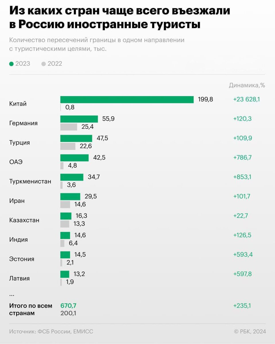 🇨🇳 Китайцы резко бросились в Россию. Количество туристических поездок за год взлетело с 800 до 199 800, следует из данных ФСБ.