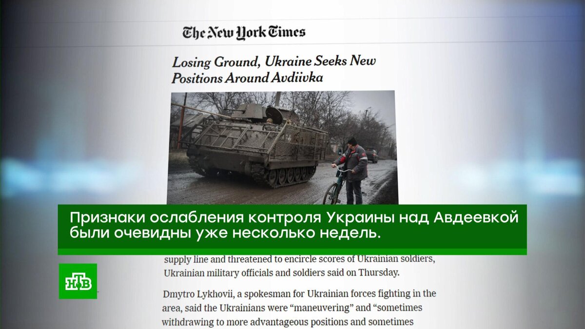 [ Смотреть видео на сайте НТВ ] Западные СМИ активно обсуждают взятие Россией Авдеевки. Телеканал Fox News назвал освобождение города значительной победой Владимира Путина и поворотным моментом в украинском конфликте, который произошел на глазах у всего мира. Журналисты The New York Times напомнили, что признаки потери контроля Украины над Авдеевкой были видны еще несколько недель назад. Издание The Guardian объясняет произошедшее истощенностью и измотанностью киевской армии и нехваткой снарядов, которая усугубилась отсутствием финансовой поддержки со стороны США. Сразу несколько СМИ — Washington Post, CNN и Еconomist — назвали взятие Авдеевки крупнейшей победой России с момента провала украинского контрнаступления и взятия Москвой Артёмовска (Бахмут). CNN пишет, что украинское противостояние повернулось в пользу президента России. А тот же Еconomist назвал вывод киевских формирований из Авдеевки ударом для ВСУ и Зеленского. [ Смотреть видео на сайте НТВ ]
