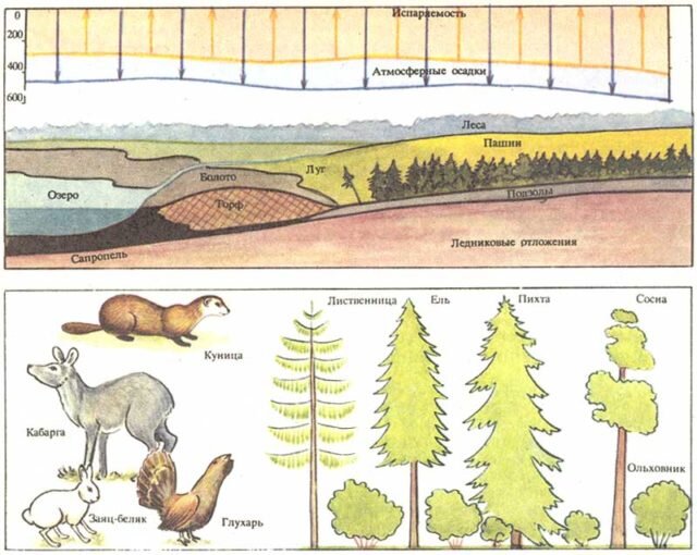 Пейзажи тайги могут варьироваться от густых лесов до открытых полян. Они включают различные типы лесов, болота, реки и озера. Многочисленные водоемы служат источником питьевой воды для животных и людей, а также являются местом обитания водных видов животных.