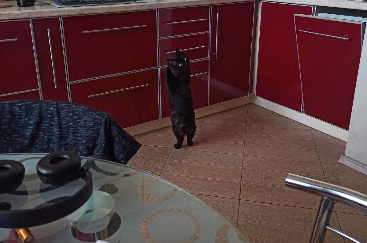 Любит супер кот встречать членой стаи. Когда кто-то из нас подходит к входной двери, Рысь стремглав бежит к выходу. Капец тому, кто окажется у него на пути, просто собьёт как кеглю. А если вы хотите приучить кошачьего носить одежду, узнайте, как это правильно сделать.