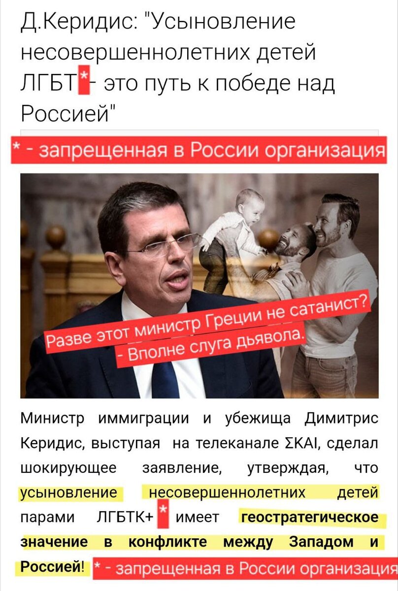 Министр иммиграции и убежища Димитрис Керидис, выступая на телеканале ΣΚΑΙ, сделал шокирующее заявление, утверждая, что усыновление несовершеннолетних детей парами ЛГБТК+ имеет геостратегическое значение в конфликте между Западом и Россией! Министр подчеркнул в заявлении, что у Греции более "неолиберальный взгляд" на православие, чем в России. Кто-то должен напомнить ему, что православие едино в любой стране, и прояснить одну вещь: оно признает только один брак, и это "брак в Господе", который был благословлен самим Господом Иисусом Христом и был заключен между мужчиной и женщиной. Нельзя быть православным христианином, принимая такой "брак" по определению. Это не вопрос "неолиберального понимания", это основа христианства. Д.Керидис попытался оправдать это заявление, обвинив... Россию. "Даже это имеет свое значение в геостратегическом соревновании между Западом, с одной стороны, который принимает права ЛГБТ и является открытым, либеральным обществом, и Россией, которая с фанатиз