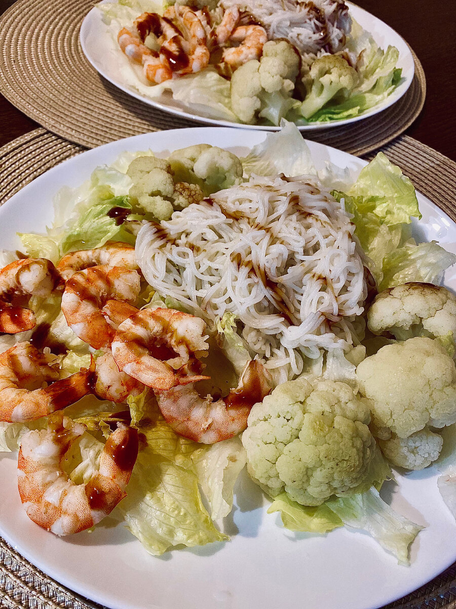 Креветки с рисовыми спагетти и печёной цветной капустой