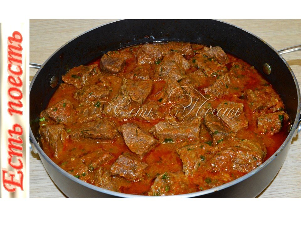Такое мясо с нежным сливочным оттенком в густой подливке с овощами буквально тает во рту. Отличный вариант к любому гарниру. Таким образом можно сделать любое мясо, корректируя время приготовления, но, говядина получается особенно вкусной! Пошаговый рецепт приготовления Мясо нарезать достаточно крупными кусочками, со сторонами около 1,5 - 2 см. Положить в сковороду или кастрюлю. Долить воду, положить резаный лук и тертую морковь. Накрыть крышкой и варить при очень слабом кипении (не тушить!) минут 45. При необходимости добавить кипяток. Затем, добавить кусочек масла, томатную пасту, резаный чеснок, соль и сахар. Если желаете, можно добавить специи. Размешать. Варить под крышкой до мягкого состояния. В зависимости от мяса, может потребоваться 1,5-2 ч, а то и больше. Если желаете больше подливы, добавляйте больше воды. К готовому мясу добавить резаную зелень. Подавать с любым гарниром. Подробнее смотрите в видео https://www.youtube.com/watch?v=anJGFNC1XVQ Приятного аппетита! ИНГРЕДИЕН