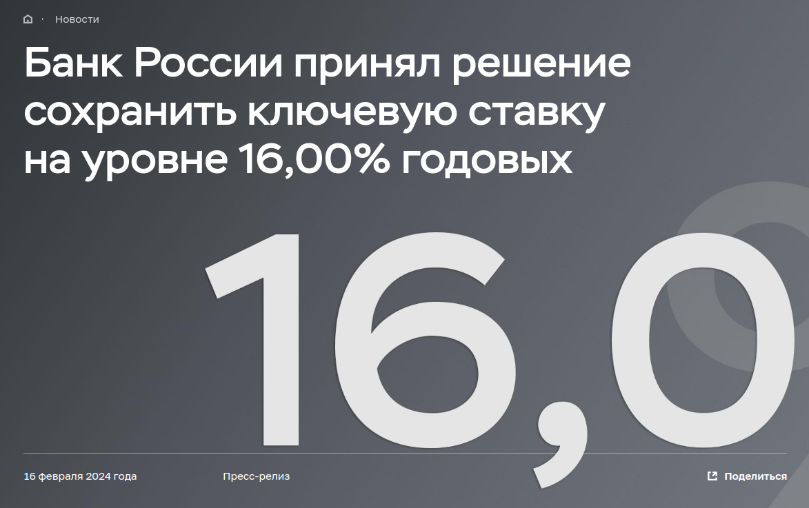 Как и ожидалось, 16 февраля Центробанк оставил ключевую ставку на прежнем уровне 16%. Глянул пресс-релиз. Если кратко, основная мысль такая: "Ничего не будем трогать, оно и так работает".