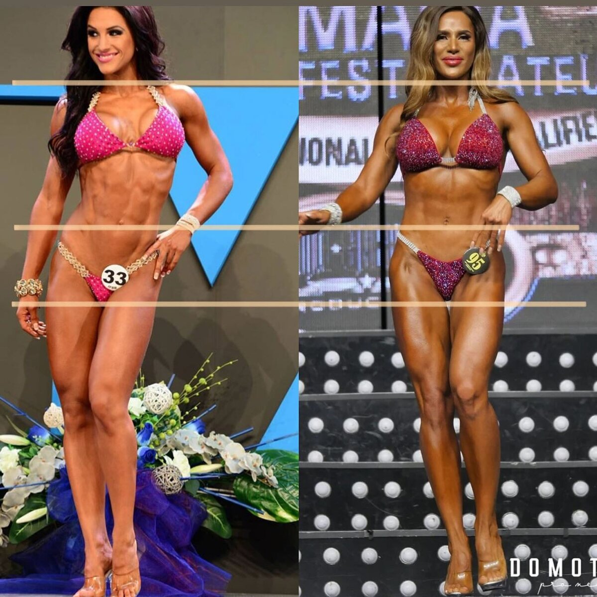 У меня, кстати, длинные ноги. Но сами видите, это не всегда плюс, особенно - в соревновательном спорте. Я специально слепила коллаж с прекрасной Николой Вайтеровой, которая всегда была для меня воплощением идеальной бикинистки - чтобы было наглядно. У неё, например, не супер узкая талия, но длина туловища больше моей, за счёт чего она выглядит тоньше. А ещё у нас разное строение мышц пресса. При этом %