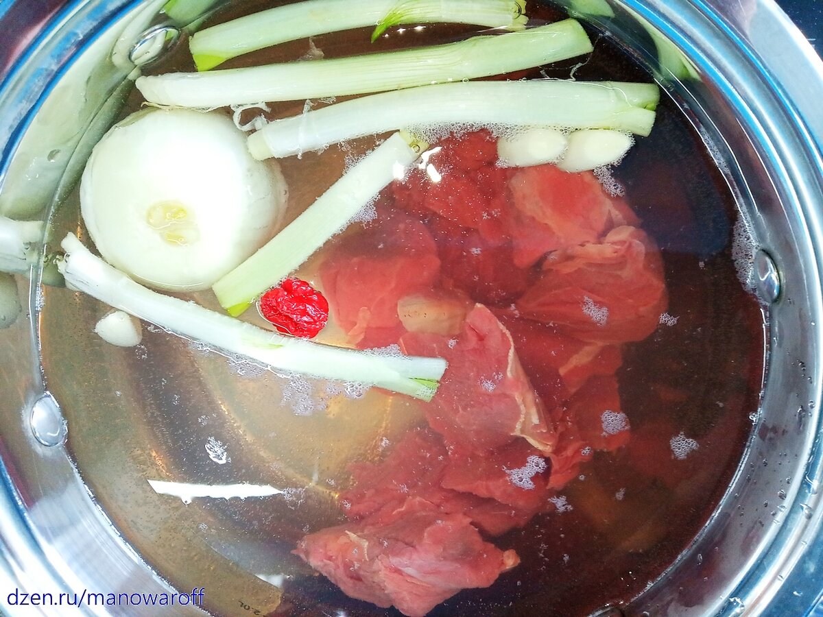 Супчик весьма вкусный и простой в приготовлении. Не требуется каких-то особых кулинарных навыков, чтобы его сварить. Конечно, это занимает некоторое время, но при этом совершенно не обязательно постоянно находиться на кухне. Для приготовления четырех порций нам понадобится: Наливаем в кастрюлю воду, кладем туда говядину, репчатый лук, белые части зеленого лука и пять зубчиков чеснока. Доводим до кипения, периодически снимая образовавшуюся пену. Затем убавляем огонь. После того как пена перестанет появляться, добавляем молотый имбирь и накрываем кастрюлю крышкой. Готовим на минимальном огне в течение двух часов.
