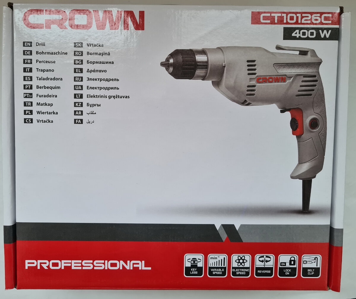 Безударная дрель CROWN CT10126C (400Вт.) Добрый день, уважаемые читатели и подписчики моего канала! Деятельность компании CROWN началась еще в 1983 году в Китае с производства абразивных дисков, сделав упор в своей работе на надежность, качество и практичность всей выпускаемой продукции настоящее время, это один из крупных производителей (электроинструмент, пневмоинструмент, сварочное оборудование, станки, геодезические и лазерные приборы, техника для сада, оснастка и др) в Китае. Дилерская сеть CROWN есть в более 45-50 странах мира, в т.ч. и в России. В сегодняшней публикации мы распакуем и рассмотрим безударную дрель СТ10126С, которая предназначена для сверления различных материалов, таких как металл и дерево. С завода-изготовителя дрель поставляется в картонной коробке. Внешний вид коробки достаточно привлекателен, можно увидеть габаритные размеры дрели, максимальные параметры сверления: в металле 10мм., в дереве до 20мм. Бесключевой патрон - это специализированный самоцентр