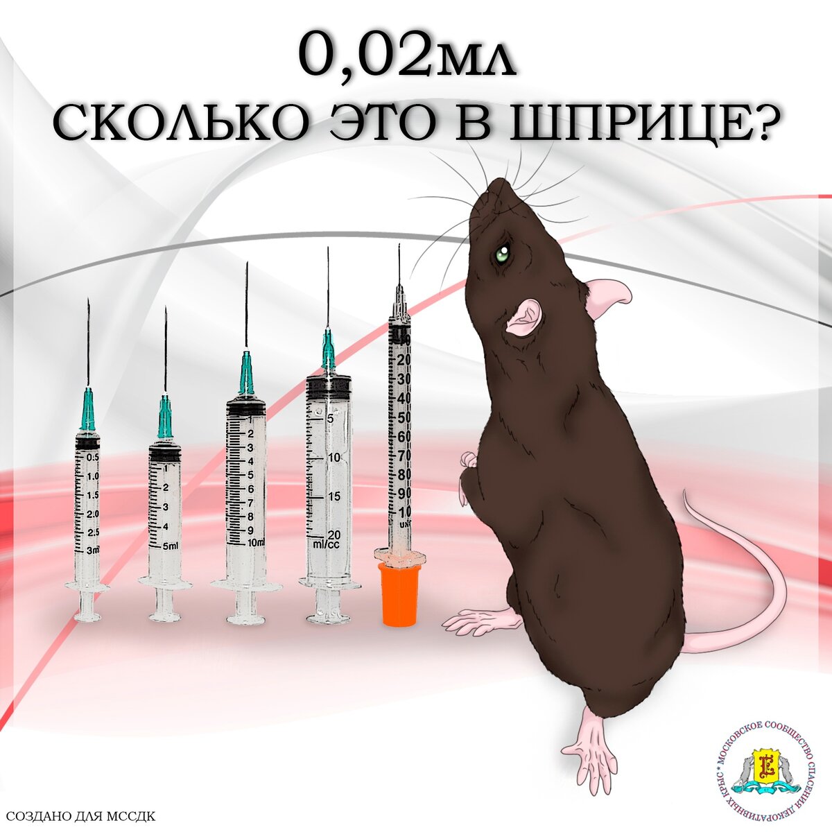 Все или почти все из вас сталкивались с необходимостью делать крысам уколы. Очень часто вы спрашиваете — А сколько это будет в шприце? Давайте разбираться. Итак, берем инсулиновый шприц и смотрим. Ну, во-первых — инсулинки бывают разные. Чаще всего мы пользуемся шприцами объемом 1 мл. А вот дальше начинаются сложности. Шкала инсулиновых шприцев с объемом 1 мл бывает поделена на разное количество делений (или ЮНИТ — units) — на 100, или на 40. Получается, что если в шприц U100 набрать половину, т.е. 0.5 мл, поршень будет находится на цифре 50. Если набираем половину шприца U40, то поршень будет на цифре 20. При всем том объем набранного лекарства одинаковый, 0.5 мл. Рассмотрим самые маленькие деления: На шприце U100 самое маленькое деление, где еще даже на написаны цифры, равняется 0,02 мл. До первой цифры нарисовано 4 черточки, значит шкала поделена на 5 делений. (Реже встречаются шприцы с делением на 0,01 мл). Первая цифра от носика, которую мы видим, это 10. То есть это 1/10 миллили
