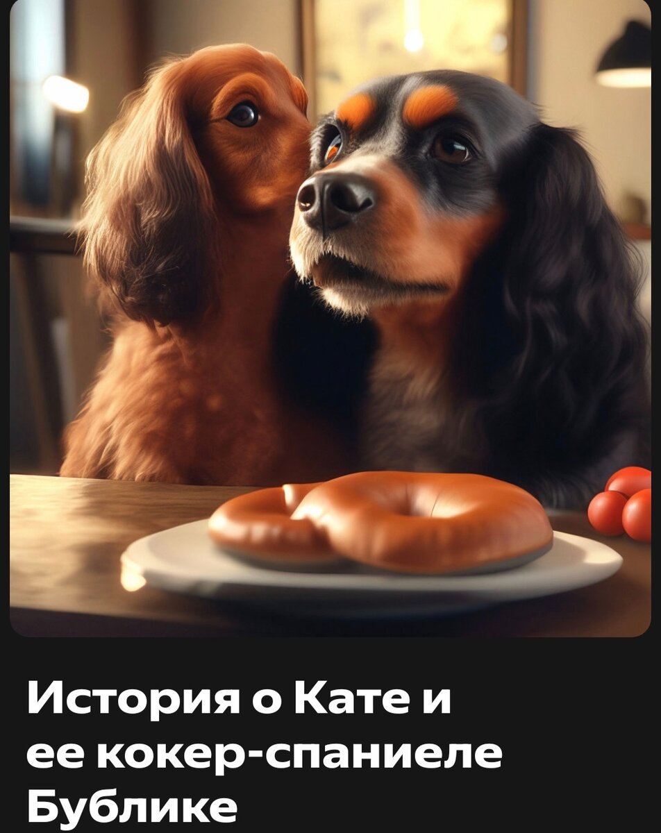 История о кокер-спаниеле по кличке Бублик . В одном маленьком городке, где не было никаких собак, жила девочка по имени Катя. Она очень любила животных и мечтала о собаке. Однажды, когда она гуляла по парку, она увидела маленького щенка кокер-спаниеля. Он был такой милый, что Катя сразу же решила его забрать домой. Она попросила у родителей разрешения на покупку щенка, и они разрешили ей это сделать. Катя назвала щенка Бубликом и начала ухаживать за ним. Бублик был очень игривым и ласковым щенком. Он любил играть с Катей и другими детьми в парке, а также бегать за мячом. Каждый день Катя выводила Бублика на прогулку, чтобы он мог побегать и поиграть в парке. Однажды, когда Катя гуляла с Бубликом в парке, она заметила, что к ним приближается злой мальчик. Он хотел забрать Бублика и сделать с ним что-то плохое. Катя испугалась за своего питомца и решила защитить его. Она крикнула мальчику, чтобы он не подходил к Бублику, но он не послушал ее. Катя побежала к Бублику и начала защищать