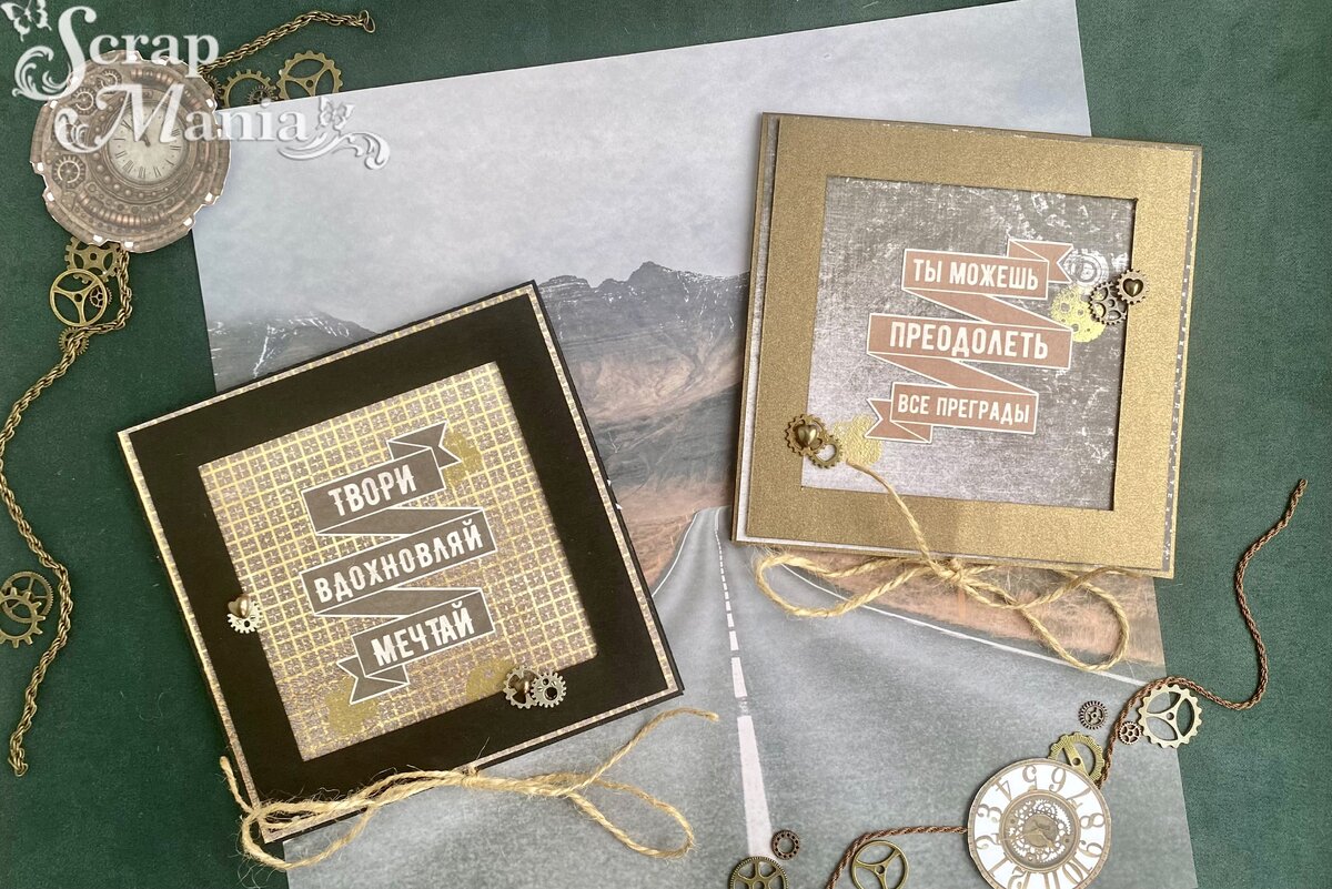 Всем привет! Сегодня вдохновляю Вас я - Татьяна Саакова и коллекция «Скорость без границ» Мужской праздник - это особый вид творчества, отдельное искусство, я бы сказала. Я подготовила для вашего внимания две открытки с интерактивными элементами. Не смотрите что они выглядят «просто» внешне, внутри кипит работа. В этой, бесспорно, нужной коллекции, как раз про движение. Открытки имеют формат 15х15 см, снаружи рамочки, украшенные железными шестеренками и золотым эмбоссингом. Можно было сделать лаконичные работы с фоновым диз. картоном такого же цвета как и коллекция, но я сделала специально контрастную. Там, где медный цвет, я добавила чёрного и, соответственно, где серый цвет - я добавила медного. По итогу у меня получился внутри практически монохром из листов с картинками и вырезных элементов из основной коллекции, а снаружи контраст. Сверху открыток вы можете видеть флажки, также вырезанные из листа с картинками. В главных ролях у меня эксклюзивные авто. Можно было взять пару ретро а