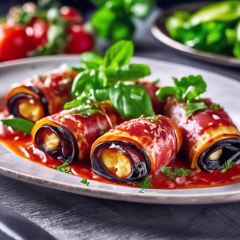 Рецепт: Баклажанные рулетики с сыром и колбасой.