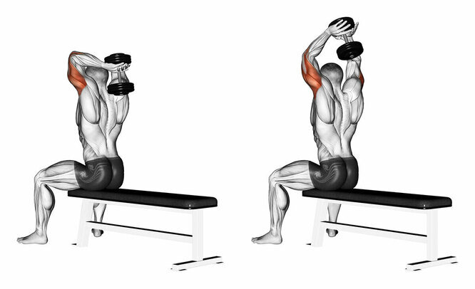 Разгибание рук с гантелей из-за головы сидя. Упражнение выполняется в устойчивой позиции, что позволяет лучше контролировать движения и избежать использования инерции. Оно может быть более комфортным для людей с проблемами спины или плохой координацией.