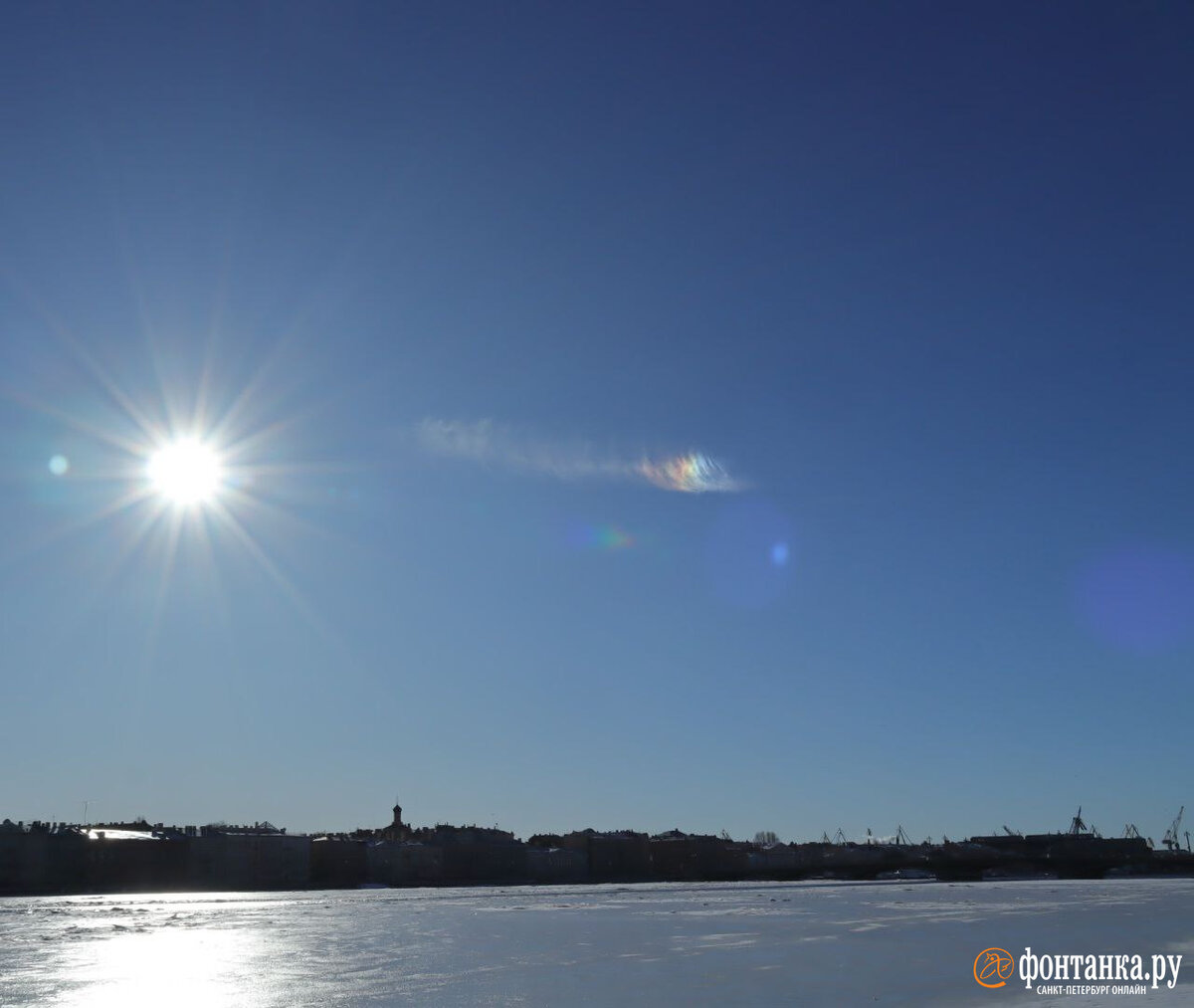 Петербурженка Ирина заметили в небе над городом радужное облако. Снимком она в воскресенье, 18 февраля, поделилась с «Фонтанкой». На кадре видно, как белая вуаль на голубом фоне переливается спектральными цветами.
