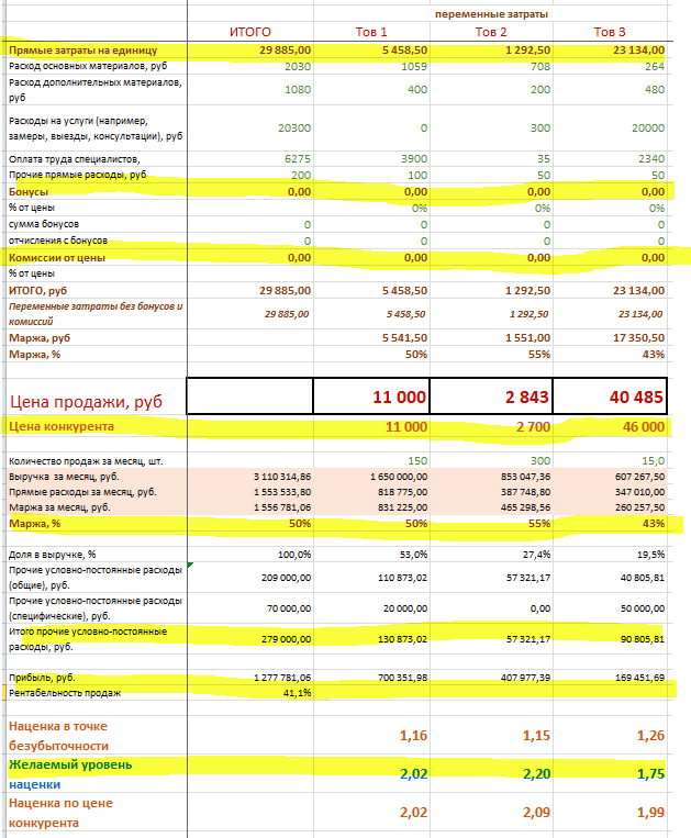 Расчет стоимости и цены в Excel. Точка безубыточности