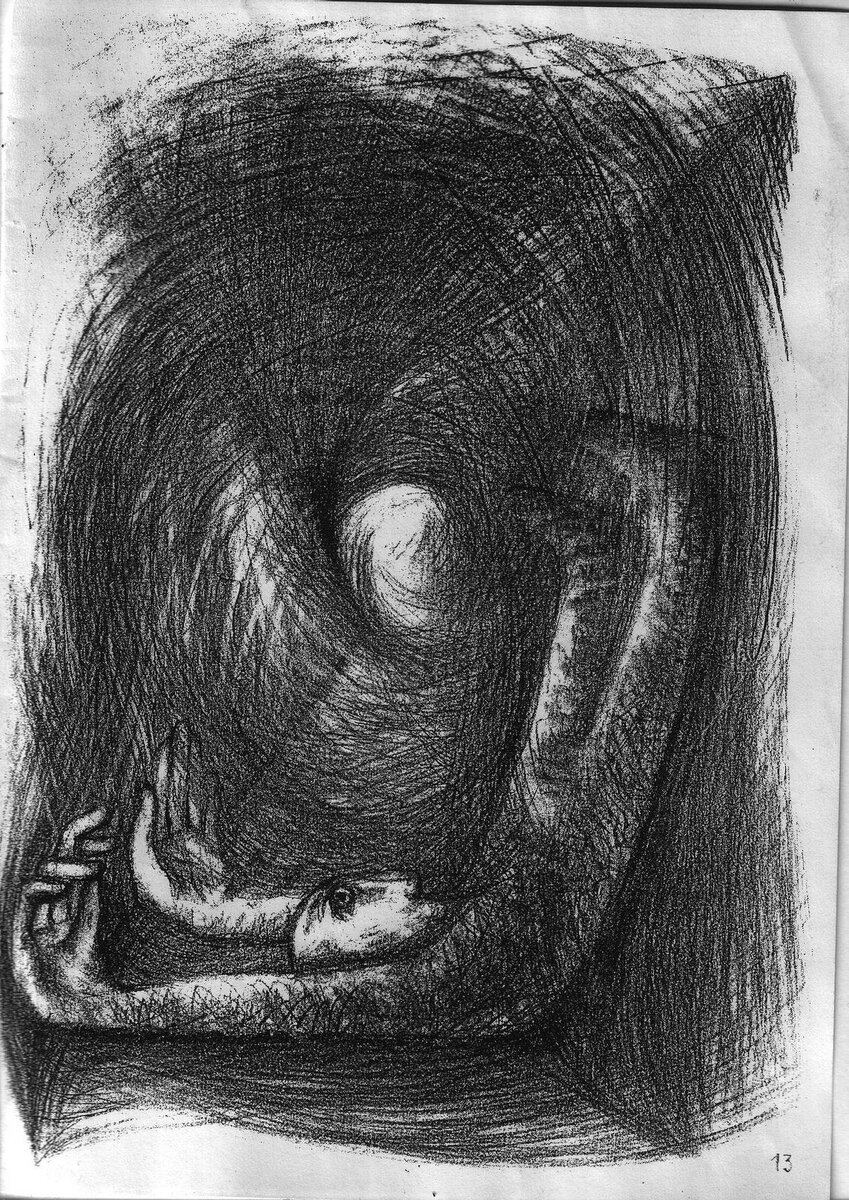 В отличие от политкорректных обозначений, самоназвания, рождающиеся в своём кругу или принимающиеся им, могут быть весьма прямыми и включать иронию на грани фола. Благодаря участию в упомянутой дискуссии я узнала о существовании радио Зазеркалье. Это коллективный просветительский и творческий проект, его создают филологи, философы, музыканты, журналисты, каждый — с психиатрическим диагнозом. Так вот, во ВКонтакте авторы рекламируют свой «сумасшедший эфир по субботам», а если заглянуть на галерею сайта, можно увидеть «сумасшедшую графику». Смотрите иллюстрацию к этой статье — работа художника, участника Зазеркалья Алексея Ляпина.