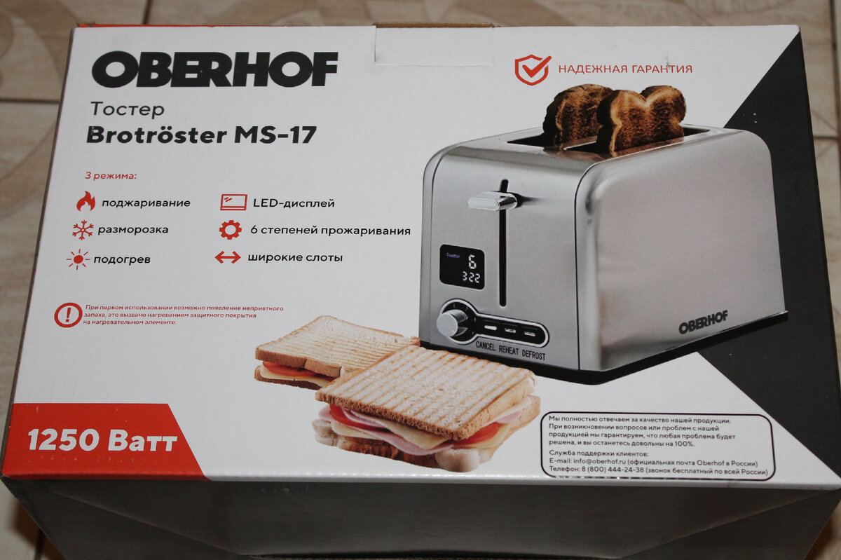 Тостер Oberhof Brotroster MS-17 С этим тостером наши завтраки стали более вкусными и аппетитными, ведь тостер готовит очень вкусные тосты с разной степенью обжарки и каждый выберит для себя подходящую. Хотелось бы скопировать сюда информацию с официального сайта бренда https://oberhof.ru/catalog/tostery/3890/ Чтобы вы увидели что этот тостер действительно замечательный: Характеристики Увеличенный размер слотов Модель Brotröster MS-17 оснащена слотами увеличенного размера 3,5 см на 22,8 см. Будьте уверены, что любимый хлеб для сандвичей обязательно поместится в тостере. Функция самоцентрирования поможет правильно разместить продукт в слоте. Чтобы достать поджаренное изделие, воспользуйтесь удобным подъемным рычагом. Технология быстрого нагрева Fast Unit Приготовление ломтиков хлеба с хрустящей корочкой в тостере Oberhof займет считанные секунды. Модель Brotröster MS-17 имеет высокую мощностью нагрева в 1250 Вт, которую удалось достигнуть с использованием инновационной технологии Fast U