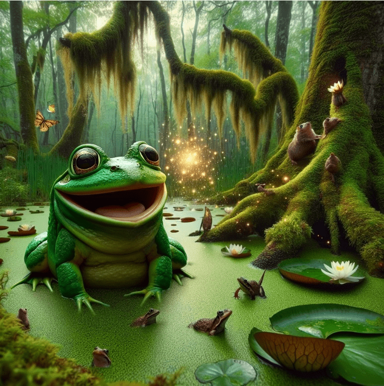 Жил–был в одном пруду лягушонок Жорик, который был маленьким и несмышленым. Он всегда делал все наоборот: когда солнце светило ярко — он прятался под камень, когда лил дождь — прыгал по лужам. Его товарищи постоянно говорили ему, что так делать нельзя, но он не слушался. Однажды Жорик услышал, как птицы говорили про красивый золотой пузырь, который находится на дне пруда. Он тут же решил его найти, не слушая советов других. Лягушонок погрузился на дно пруда и долго искал этот золотой пузырь. Наконец, он нашел что-то блестящее и радостно всплыл на поверхность. Но когда лягушонок открыл рот, чтобы показать свою добычу, оказалось, что это был обычный пузырь и он сразу же лопнул. Жорик разочарованно уставился на него и понял, что он был очень глуп. Вернувшись к своим друзьям, попросил прощения за свою глупость. Один раз лягушонок услышал, что прекрасная принцесса обещала выйти замуж за того, кто принесет ей самый красивый цветок. Не раздумывая, он отправился на поиски и вернулся с гигантск