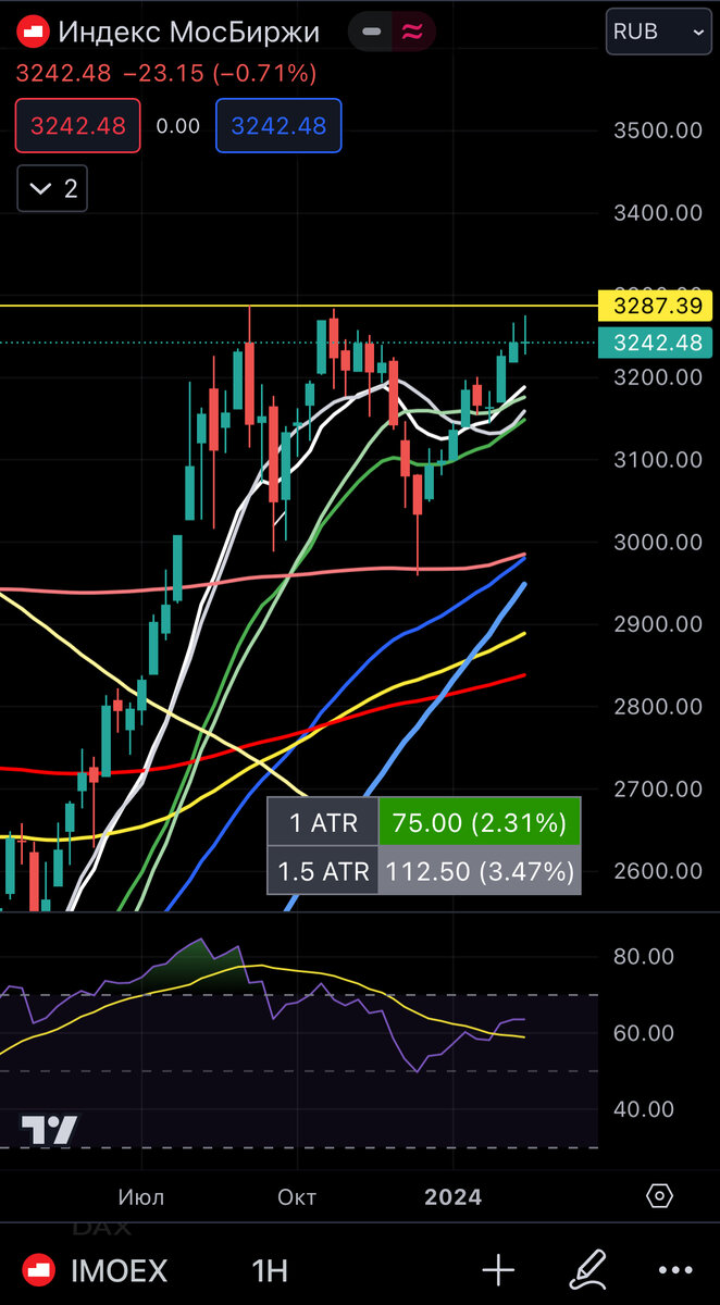 Приветствую всех читателей! Будет ли рынок продолжать рост на следующей неделе - или это начало падения? Дам несколько своих мыслей на этот счёт, но как обычно - не инвестиционной рекомендацией, не призывом к каким-либо действиям данная статья не является Каждый сам в ответе за свой депозит, как говорится. К тому же, вы можете как согласиться со мной, так и оставить своё мнение в комментариях - при наличии адекватных аргументов я всегда рад вступить в диалог. Ну а теперь, погнали. Взгляните на недельный график Мосбиржи Последние две свечки как бы намекают на потенциальный разворот в скором времени. НО При этом если глянуть на индикатор MACD например, также на недельном, то он противоречит этим двум свечкам и обещает дать первое зелёное пересечение уже на предстоящей неделе 🤷🏼♂️ Индикатор RSI в моменте 63,5 - ближе к верхней границе, но и близко не перекуплен. Скользящие - все ПОД ценой, кроме 10-дневной на дневном ТФ - то есть рынок по-прежнему в восходящем тренде. Бакс