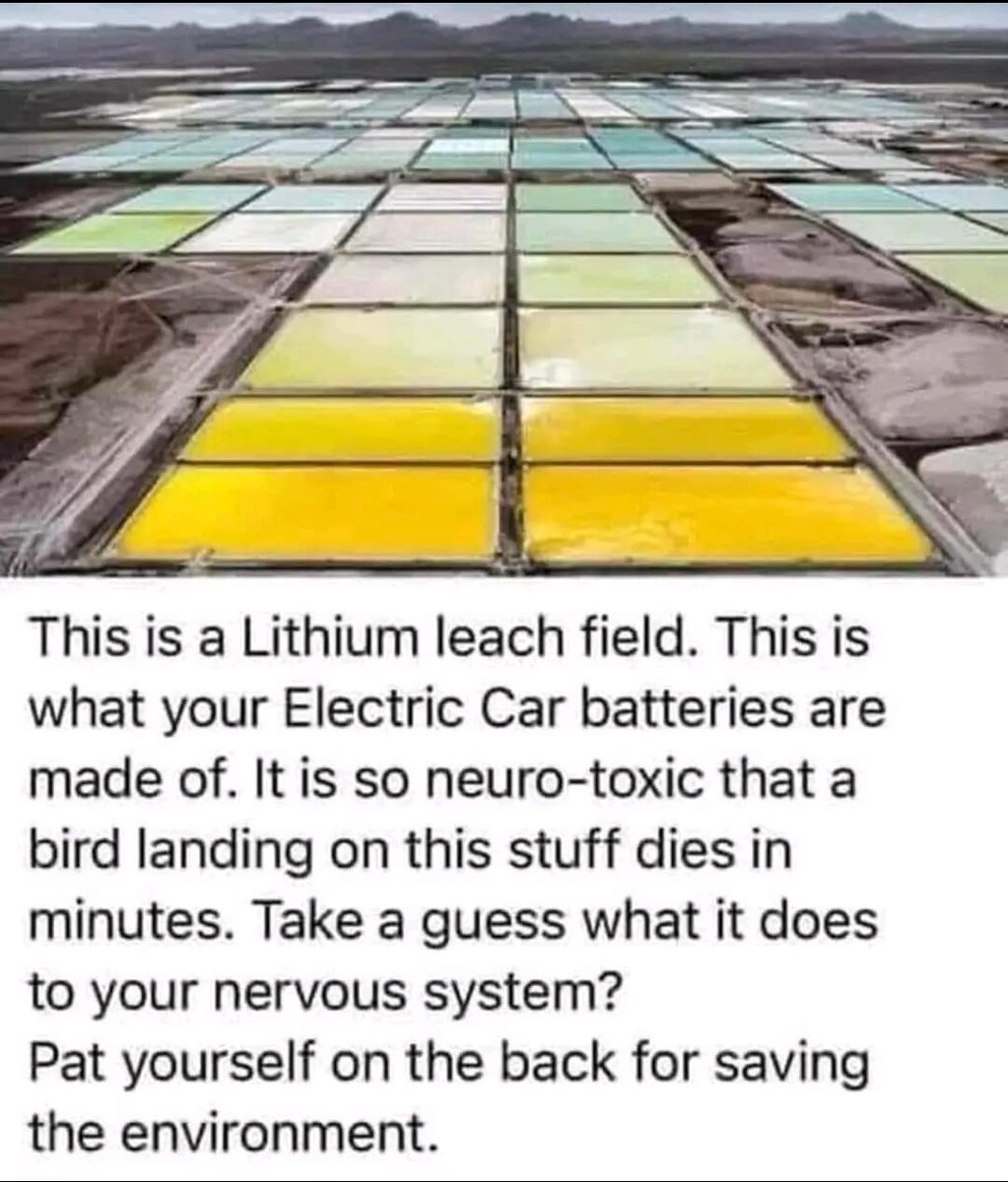 Данное фото было размещено в 2021 году, в одной из крупнейших англоязычных соцсетей и набрало более 22 000 репостов. Комментарий к фото гласит: "Это поля выщелачивания (обогащения) лития (литиевой руды). Это то, из чего сделаны батарейки для вашего Электромобиля. Это настолько сильный нейротоксин, что птица, севшая на эту штуку, умирает за несколько минут. Догадываетесь, что эта вещь делает с вашей нервной системой? Похлопайте себя одобрительно по спине за охрану окружающей среды". Рассматриваемая публикация и многие тысячи ее репостов подняли такую информационную волну, что, в итоге, проверкой достоверности информации занялись чуть ли ни в АНБ (а может и не "чуть ли ни")... В итоге, выяснилось, что на фото действительно литивый обогатительный каскад на одном из месторождений в чилийских Андах (В Чили находится до половины разведанных мировых запасов лития). Также, выяснилось, что автор поста и комментария к изображению незаконно использовал чужое фото, а сам комментарий окаща