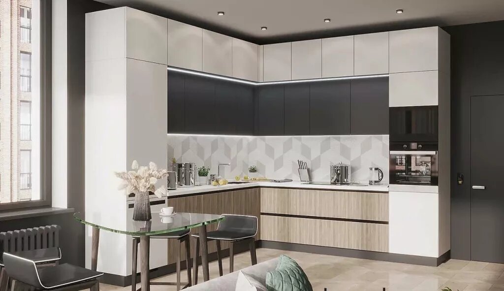 - Цвета — все оттенки серого, серо-бежевого, белые матовые фасады в сочетании с фасадами под дерево
