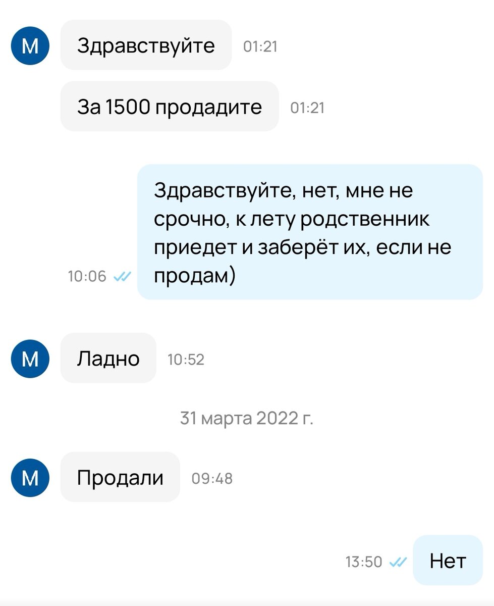 Вспомнила ещё несколько интересных случаев с Авито. Первая часть здесь: Неадекватная покупательница на Авито Вторая часть тут: Недобросовестные и просто интересные покупатели с Авито К сожалению, самую эпичную, максимально манипулятивную и просто душераздирающую переписку удалила сразу, а жаль. В двух словах: девушка хотела, чтобы я привезла товар туда, где ей удобно встретиться. Стоил он практически столько же, сколько бы я потратила на дорогу). Хотя в тот момент главная причина моего отказа была в том, что не было времени и возможности куда-то ехать. На что мне пространно ответили, что я не должна сидеть дома, должна иметь возможность куда-то выбираться и заниматься собой 😂. Логики я не поняла, и ответила, что как раз потому, что я занимаюсь собой, я не трачу время на долгие поездки ради 100 рублей. Объяснить, почему в её понимании "заниматься собой = отвезти товар на другой конец города", она не смогла. Хотя до этого прямого вопроса очень много и витиевато разглагольствовала на эту