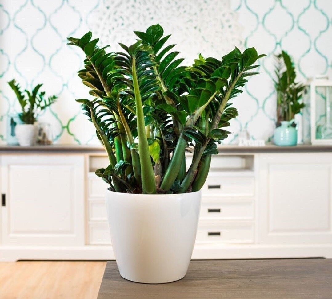 Замиокулькас, или долларовое дерево, — это растение с темно-зелёными блестящими листьями и прямыми стеблями, которое является популярным решением для украшения интерьера благодаря своей неприхотливости и элегантному внешнему виду. Уход за замиокулькасом не требует особых навыков и занимает минимум времени, что делает его отличным выбором для тех, кто хочет иметь в доме зеленый акцент, не тратя много усилий на уход. Вот несколько основных правил ухода за замиокулькасом: 1. Освещение: Замиокулькас предпочитает яркий рассеянный свет, но может переносить и непрямые солнечные лучи. Однако стоит избегать прямого солнечного освещения, так как оно может привести к ожогам на листьях. 2. Полив: Растение не любит излишне влажную почву, поэтому поливать его нужно умеренно. При поливе следите за тем, чтобы вода не застаивалась в горшке, и дайте почве немного подсохнуть между поливами. В зимнее время растение нужно поливать ещё реже. 3. Температура и влажность: Замиокулькас предпочитает тёплый к