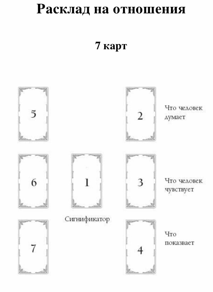Это расклад из 7 карт. Кладем три карты в столбец слева, три справа и одну посередине. Сначала вытаскиваем ту кар- ту, которая у нас будет находиться в центре, потом карты для правого столбца (выкладываем их сверху вниз), потом точно так же выкладываем карты для левого столбца. При этом средняя карта (сигнификатор) показывает общую ситуацию, или есть ли отношения вообще, насколько они прочные. Сигнификатором может быть и сама ситуация, и человек. Допустим, если это «Король жезлов», то отношения зависят от человека, которого эта карта обозначает. Например, это служебный роман с вашим боссом, а он принадлежит к огненной стихии – Овен, Лев или Стрелец по знаку Зодиака или асценденту. Карты справа указывают на партнёра, слева – на вопрошающего. Скажем, справа верхней картой выпадает «туз пентаклей». Получается, что отношения мужчину абсолютно не занимают, он больше думает про работу, про деньги, или, может, он помогает вам финансово, но при этом считает, что имеет право вами пользоваться.