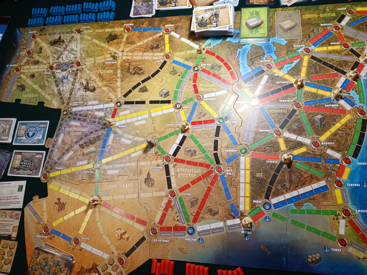 Внимание! В этой статье будут спойлеры. Если планируете проходить эту игру, прочитайте ее после прохождения!!! Десятую партию кампании мы начинали с такой картой Главной интригой этой партии было сколько можно заработать на поисках сокровищ. Мы не сговариваясь взяли не много маршрутов, чтобы приложить больше усилий в прокладывании путей к старателям. Я взял три маршрута. Два из них были очень близки, и я их выполнил с небольшими ответвлениями. Третий маршрут я не выполнил, и сбросил его по свойству Билетера. Не выполнил, потому что у меня закончились вагоны (хоть их и было 50 шт.) Сиэтл-Ноксвил, и Реджайна-Саванна я проложил без проблем. Первых старателей я "привез" из Чикаго. Потом проложить маршрут до Джексонвилла, Девенпорта и Сан-Антонио не составило труда. В итоге я привез старателей из четырех городов, жена из трех, дочь из двух. Как я предполагал, награда оказалась между 10 и 20 долларами. Я получил 11, 12, 16 и 17 долларов. То есть как за 4 довольно длинных маршрута. Вот такие