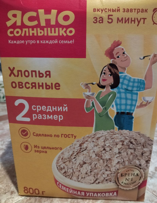 Рецепт: 2 куриных яйца -114 г Молоко 2,5% - 32 г Вода - 30 г Лук зеленый - 10 г Чеснок сушеный - 2 г Сыр 50% (типа Российский) - 38 г Соль морская крупная - 2 щепотки (по вкусу) Масло подсолнечное - 2 г Хлопья овсяные быстрого приготовления - 37 г (у меня вот такие): В миске замешать хлопья+соль+молоко+вода+яйца. Накрыть миску и убрать тесто в холодильник на 6-10 часов ( я убираю на ночь). Далее замешать в тесто порезанный зеленый лук + чеснок сушеный. Натереть на крупной терке сыр в отдельную тарелку. Смазать сковороду подсолнечным маслом (капля масла + силиконовая кисточка для распределения масла по сковороде). У меня сковорода Ф16 см для удобства переворачивания, на которой получается 2 лепешки по данному рецепту. На прогретую сковороду вылить 1 часть теста (половину), разровнять ложкой и накрыть крышкой на 2-3 минуты. Жарить на среднем огне. Как только лепешка схватится, перевернуть и сразу выложить 1 часть (половину) натертого сыра и снова накрыть крышкой на 2 минуты. Готовую леп