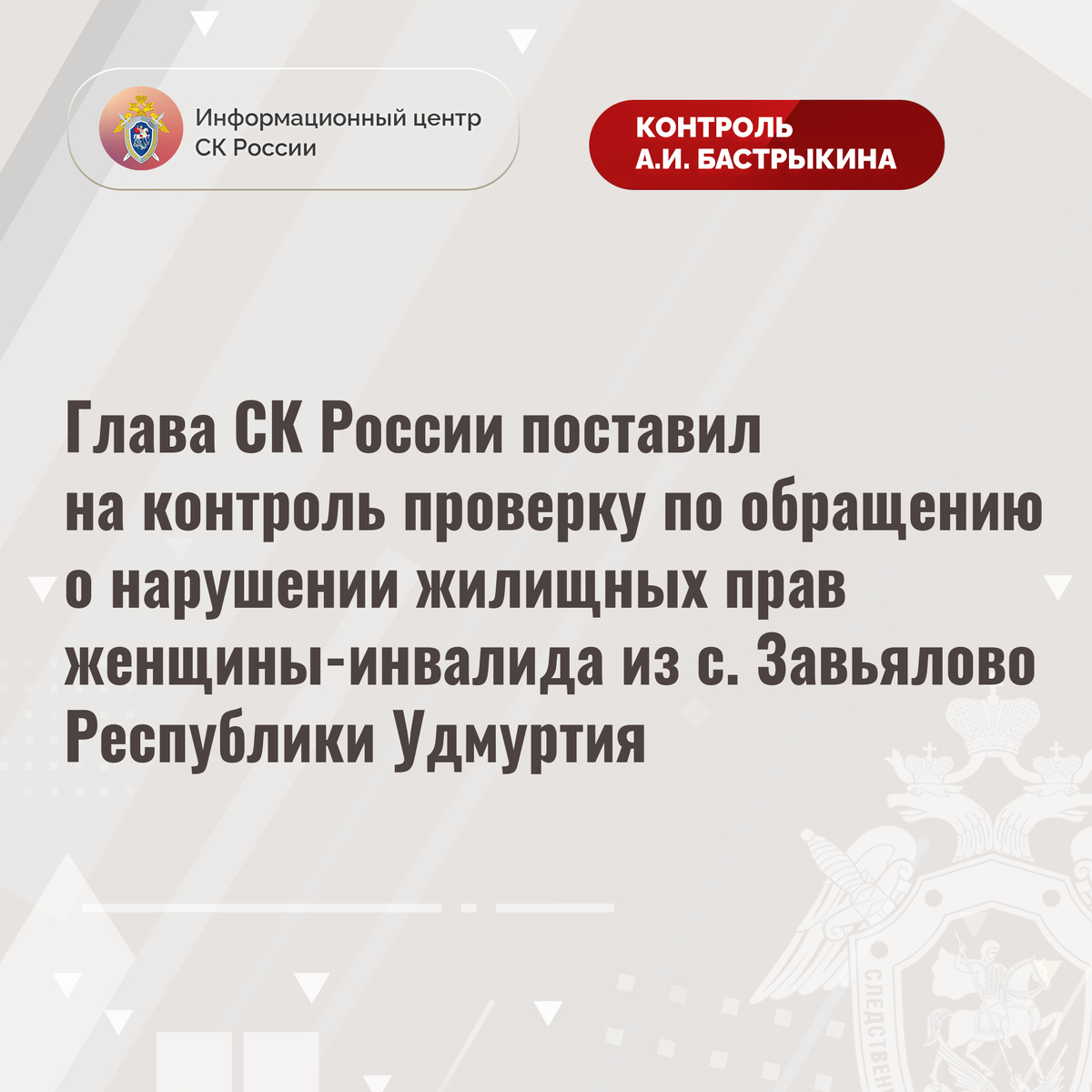 Глава СК России поставил на контроль проверку по обращению о нарушении жилищных прав женщины-инвалида из с. Завьялово Республики Удмуртия